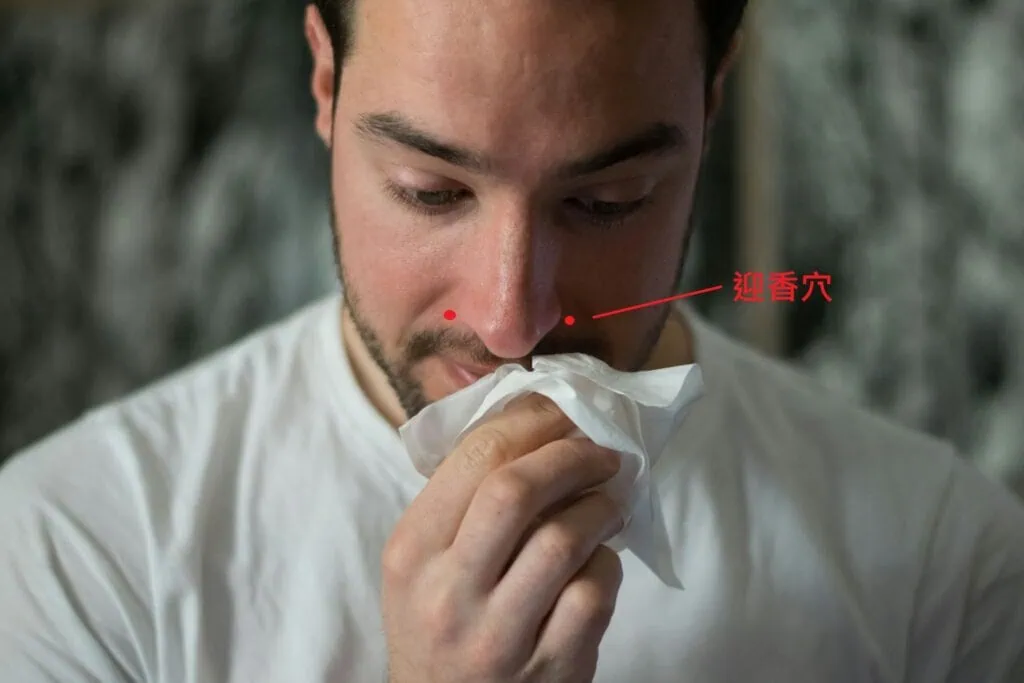 - 迎香穴:鼻水流不停的時候可按壓。於鼻下緣切線與法令紋交界處(鼻翼兩旁外下的地方),按壓會有痠脹感,穴在鼻旁,亦於鼻塞不通,聞不到味道時有效。