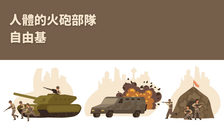 如果把人體比喻成一座城堡,自由基就像火砲部隊。在入侵者(病原體)來襲時,會幫助士兵(免疫系統)抵抗入侵者。但如果火砲太多就很容易失控,明明入侵者已經陣亡,卻還在持續轟炸,城堡就被破壞。