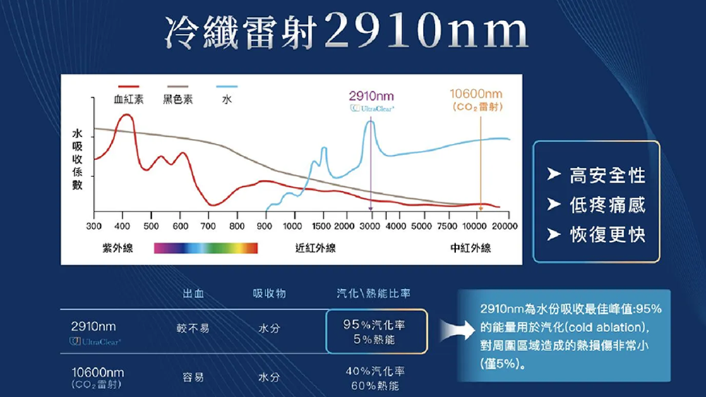 傳統飛梭雷射波長多為 10,600nm,以熱能汽化皮膚組織,可能刺激膠原相關反應,但也容易造成紅腫與熱損傷。冷纖雷射(UltraClear)採用 2,910nm 的中紅外線波長,具有極高的水吸收效率,可在短時間內汽化角質與老化組織,同時將熱能控制在最低。