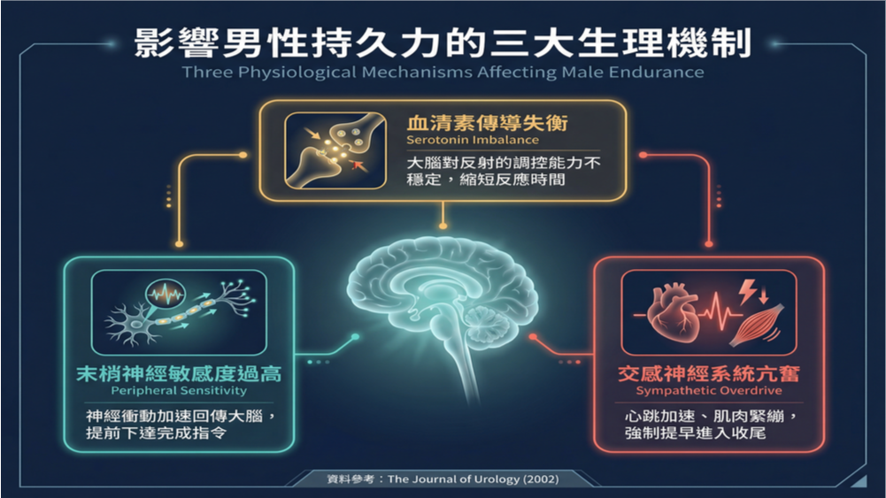 根據《性醫學期刊》(The Journal of Sexual Medicine)的神經生理學文獻指出,男性的射精控制是一個由大腦下行路徑與周邊神經網絡共同協調的複雜過程。當這個過程中的某些環節出現失衡,就會導致提早結束。主要可歸納為以下三大生理機制: