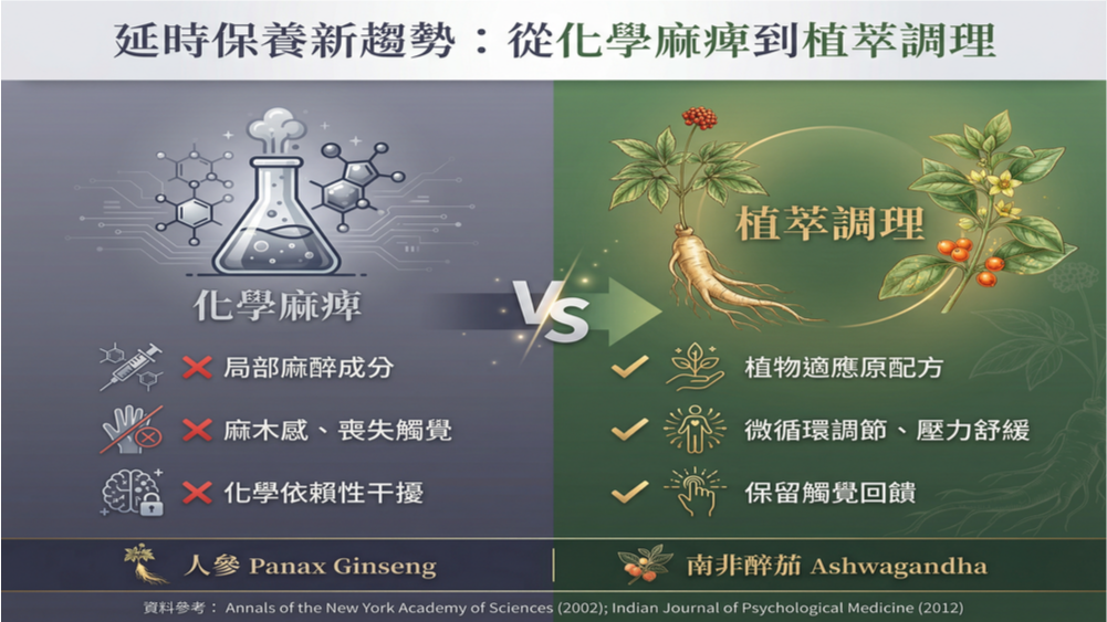 圖說:化學麻痺 vs 植萃調理對比圖:化學麻痺與植萃調理兩大延時策略優劣對比圖