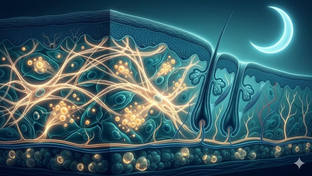 我們進入深度睡眠後,身體會大量分泌生長激素,皮膚的細胞代謝速度也明顯提升:表皮細胞的更新速度在夜間可達白天的將近兩倍。與此同時,皮膚的微血管循環變得活躍,有助於將氧氣與養分輸送到各個細胞,並帶走白天累積的老廢代謝物。