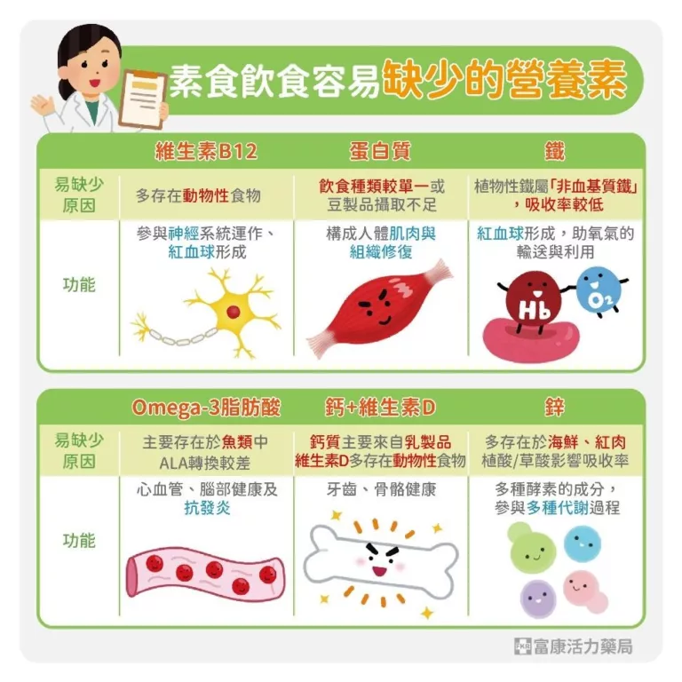 - 維生素B12:是素食者最常被提醒的營養素之一。由於B12主要存在於動物性食物中,全素者特別需要留意,若長期攝取不足,可能影響紅血球形成與神經系統功能。